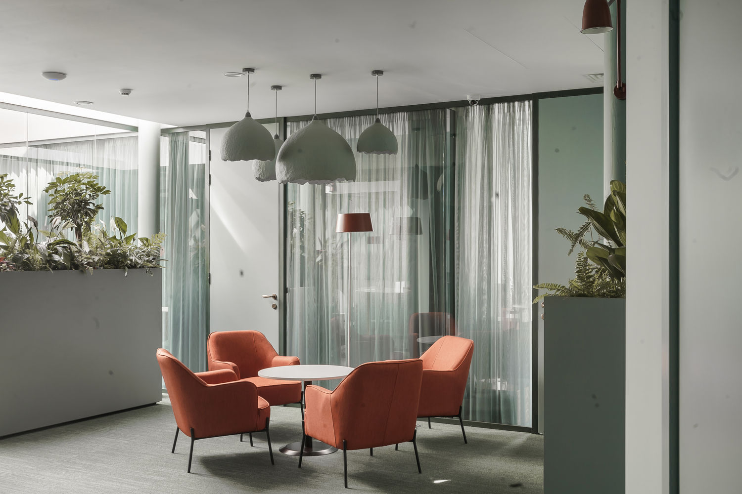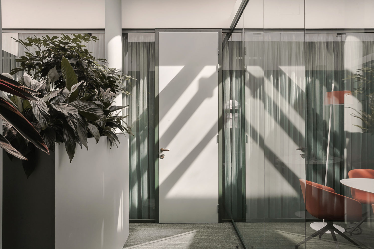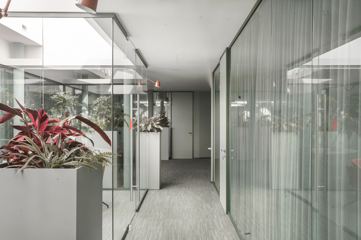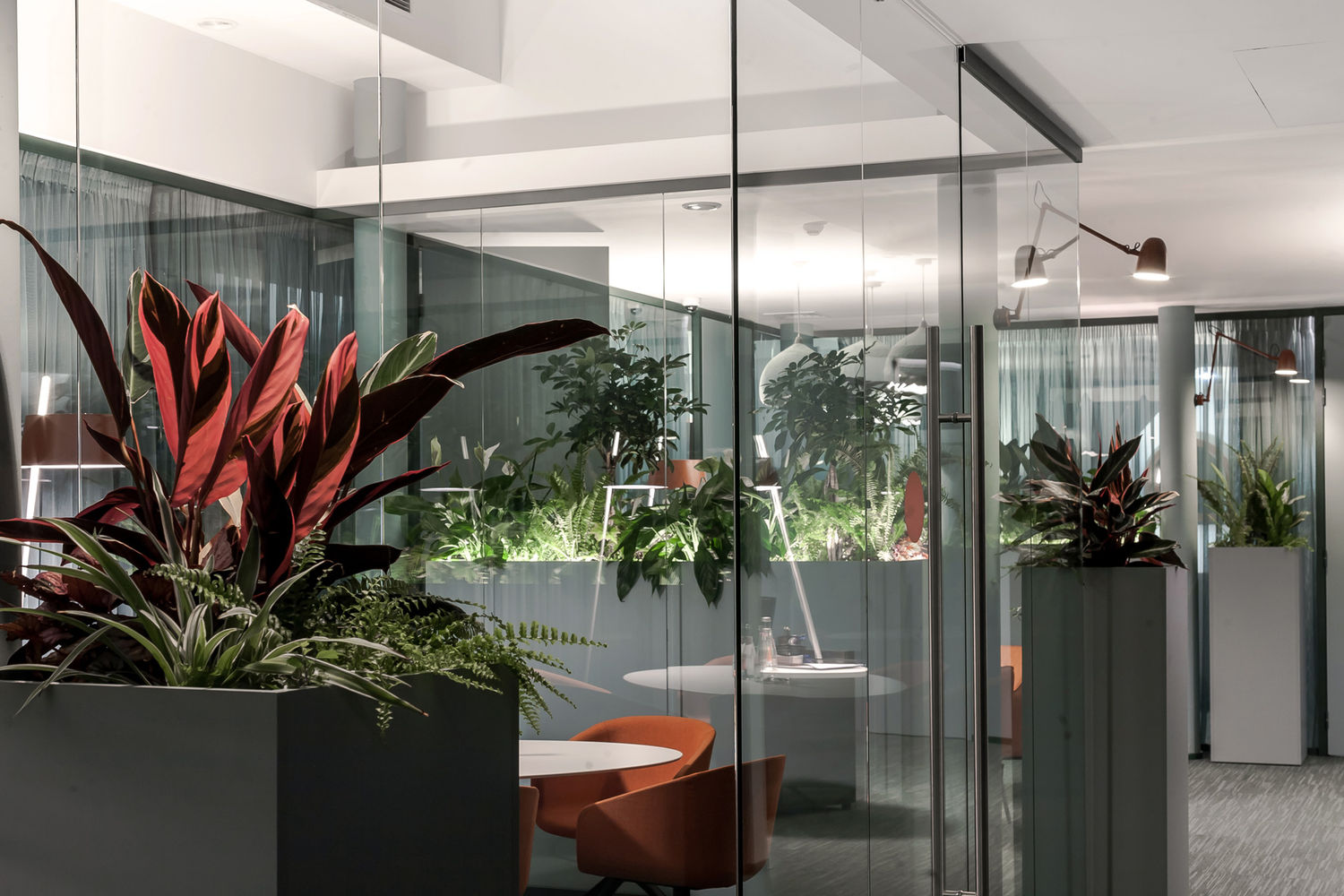 Поистине стильный, современный, функциональный, интересный, дышащий жизнью офис инвестиционной компании, реализован специалистами UALCOM совместно с Архитектурной студией " Романа та Дмитра Селюків". Материалы для нового офиса проходили тщательный отбор и корректировку на всех этапах работ. По причине того, что кабинеты руководителей находятся на отдельном этаже, особенно важно было грамотно организовать рабочее пространство - 2 кабинета руководителей отделили от общей переговорной зоны перегородками UALCOM-Twin с звукоизоляционными дверьми Magic. Стекла в дверях полностью декорированы цветом по Ral 5008. А помещение для переговоров отделено от общего холла мобильной стеной немецкого партнера UALCOM, компании Hufcor.